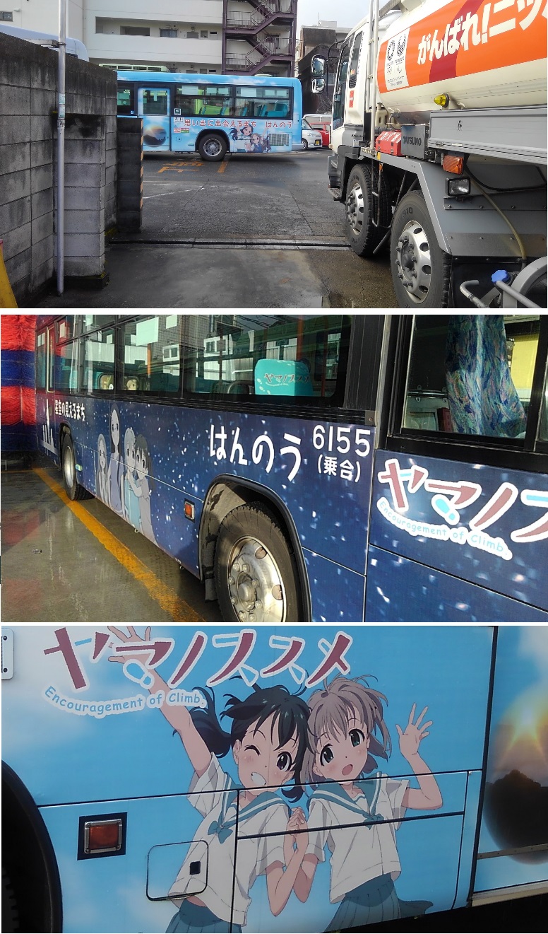 投稿いただきました 荷卸ししていたら、ラッピングバスに遭遇しました 飯能が舞台のアニメ 「ヤマノススメ」(サードシーズン) のラッピングでした。 飯能市イメージアップの戦略のようです。 飯能市は、よく伺う場所も多いので 応援します☆