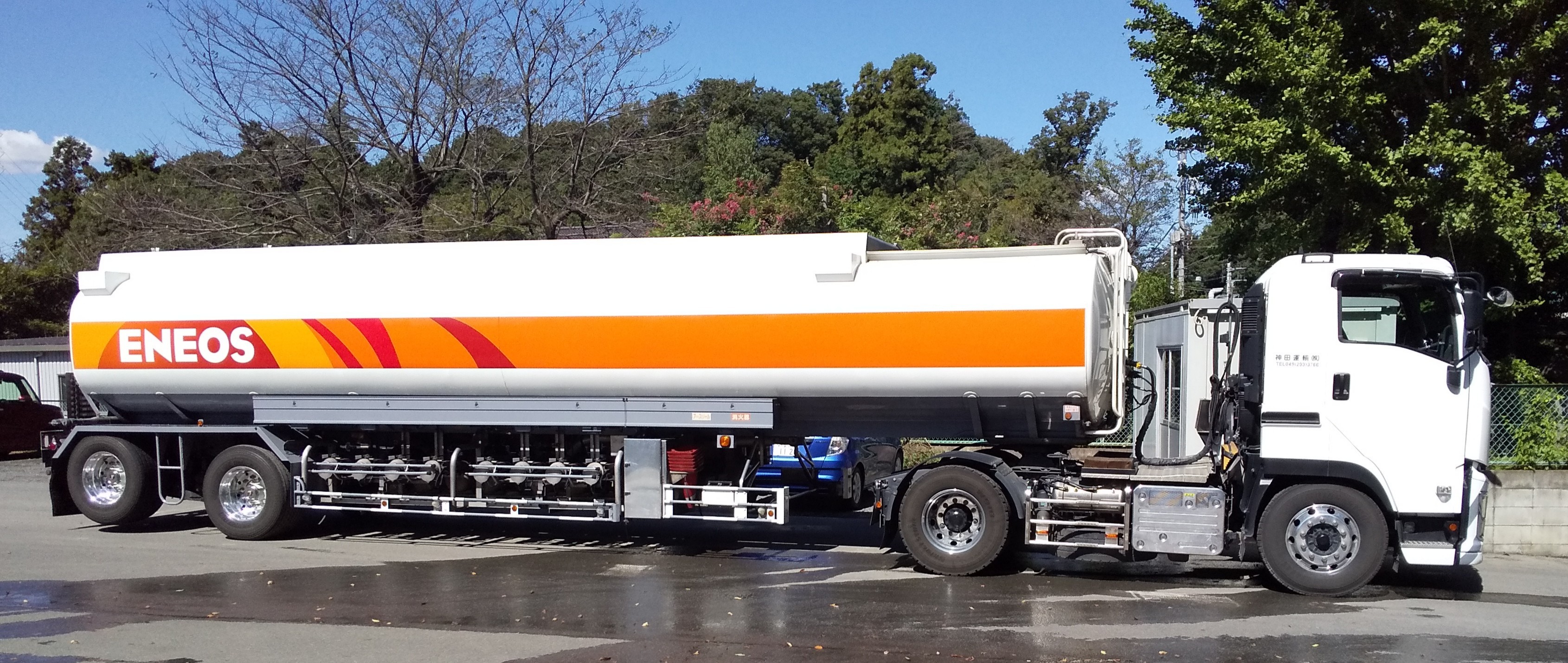 日本最大級のタンクローリーという事になります。独立配管のため吐出口が8本並んだマッシブな外観は迫力満点です。ブランド統合によってENEOSカラーになりましたが、存在感は変わらずピカイチですね。